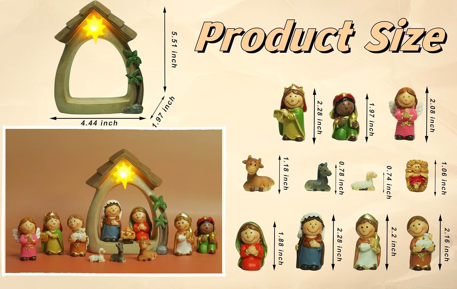 • 【Display Occasion】: The nativity sets for Christmas are perfect for displaying on a shelf, a tabletop surface, and on a nightstand as a decorative statement piece. You can also display bedrooms, living rooms, kitchens, offices, bookshelf and so on.