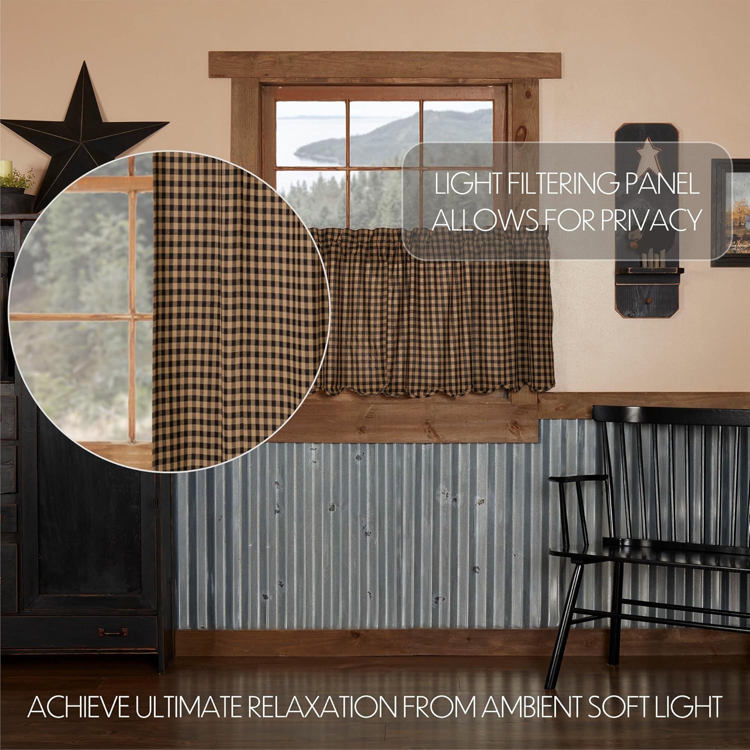Dark khaki tan and burgundy red checkered plaid add a relaxed, primitive feel to your windows. Our Burgundy Check Scalloped Tier Set measures 24 inches long by 36 inches wide and includes a softly scalloped edge. The rustic country pair of short, tier-style curtains is constructed with 100 percent cotton for easy care and is machine washable and iron safe. The curtains are fully lined with a soft white fabric to offer increased protection from the sun and fading. Includes a 3.25 inch rod pocket for easy hanging.